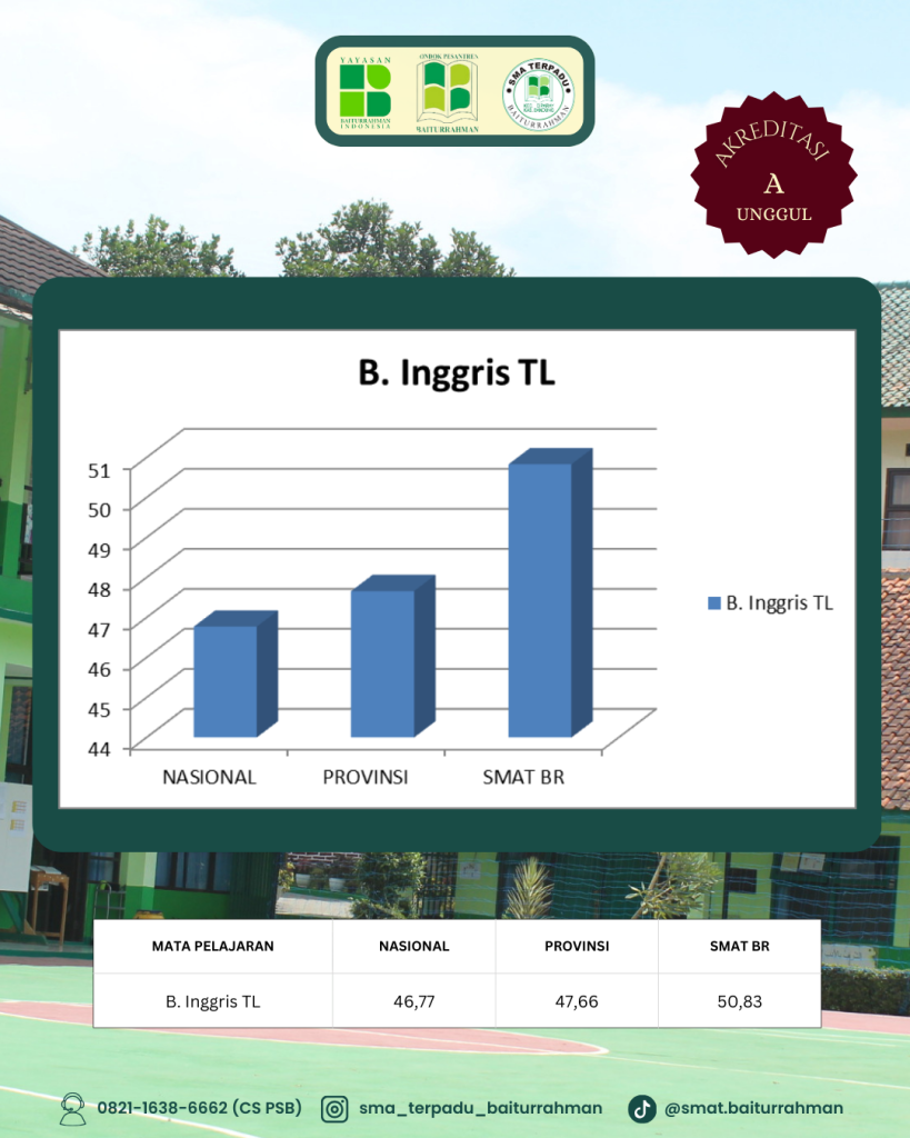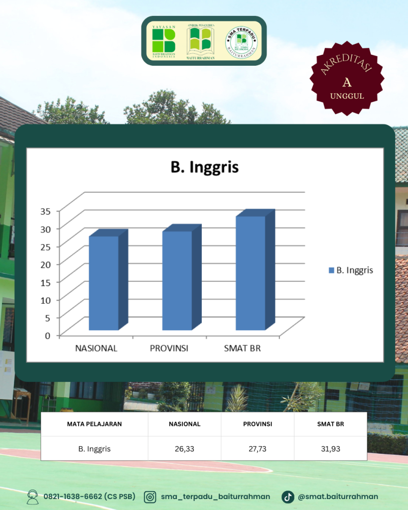 Nilai rata-rata SMA Terpadu Baiturrahman (58,92) berada di atas rata-rata Nasional (50,67) maupun rata-rata Provinsi Jawa Barat (50,19).