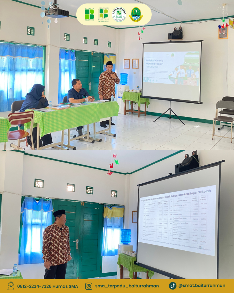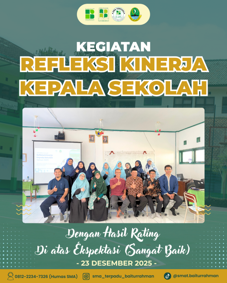 Alhamdulillah, kegiatan akhir semester ganjil di tutup dengan kegiatan Refleksi Kinerja Kepala Sekolah (RKKS) SMA TERPADU BAITURRAHMAN yang dilaksanakan pada 23 Desember 2025 ini membuahkan hasil *Di Atas Ekspektasi*. Pencapaian ini bukanlah keberhasilan personal, melainkan buah dari kerja keras, soliditas, dan doa seluruh keluarga besar sekolah.